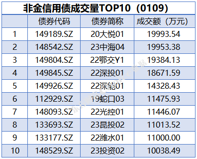非金信用债方面,1月9日交易所成交量前三的债券为:20大悦01、23中海04、22鄂交Y1;交易所涨幅前三的债券为:20阳城04、20旭辉02、20金地01。